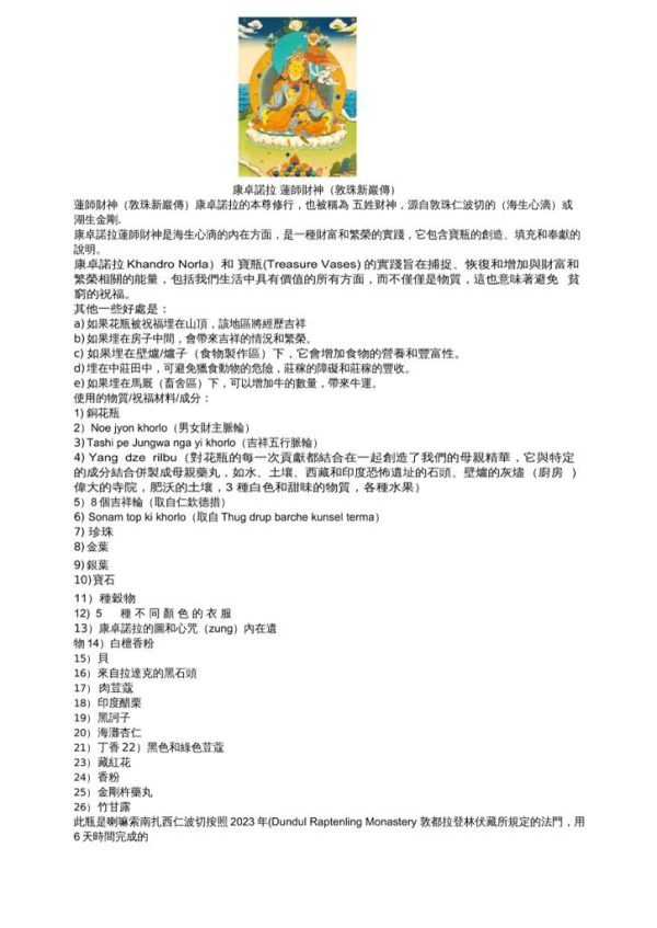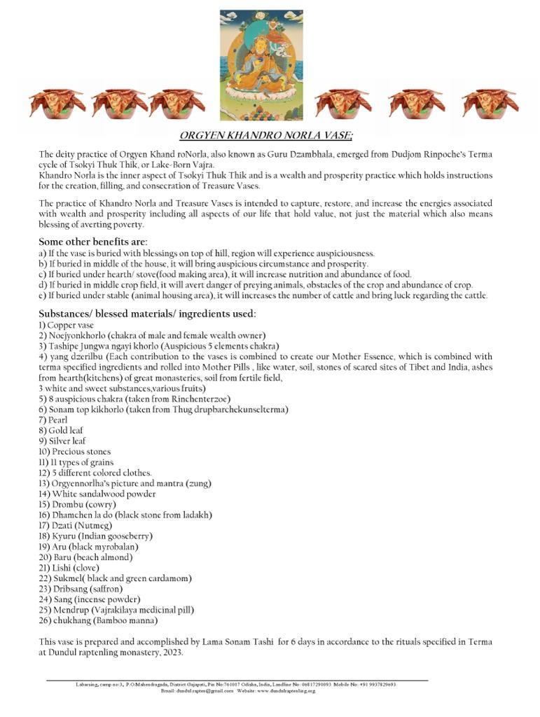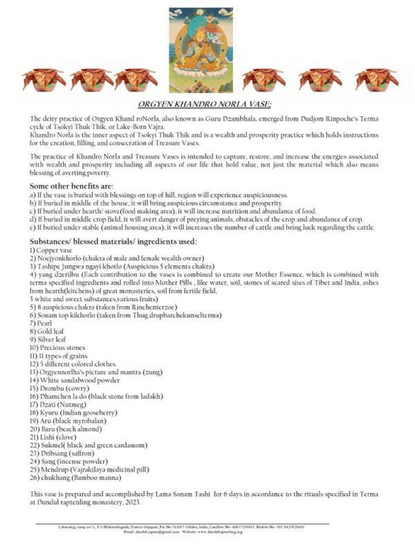 Orgyen Khandro Norla is the inner aspect of Tsokyi Thuk Thik and is a wealth and prosperity practice which holds instructions for the creation, filling, and consecration of treasure vases.